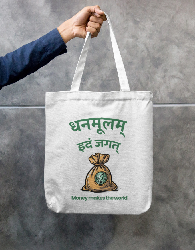 Be the first to review “Tote Bag Zipper Dhanamūlam idaṃ jagat”